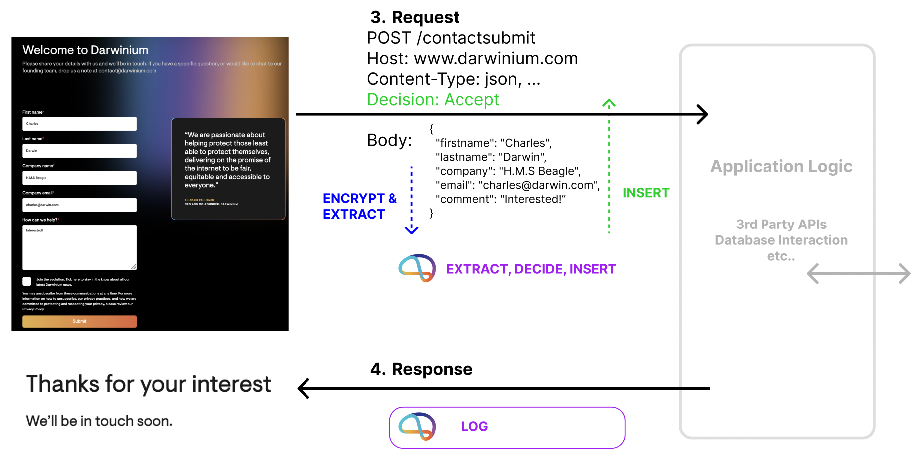 Insertion is also useful for adding Headers to requests with extra insights and decisioning from Darwinium. That can be combined with extraction of any useful data and identifiers contained within the request too, to be considered and stored.