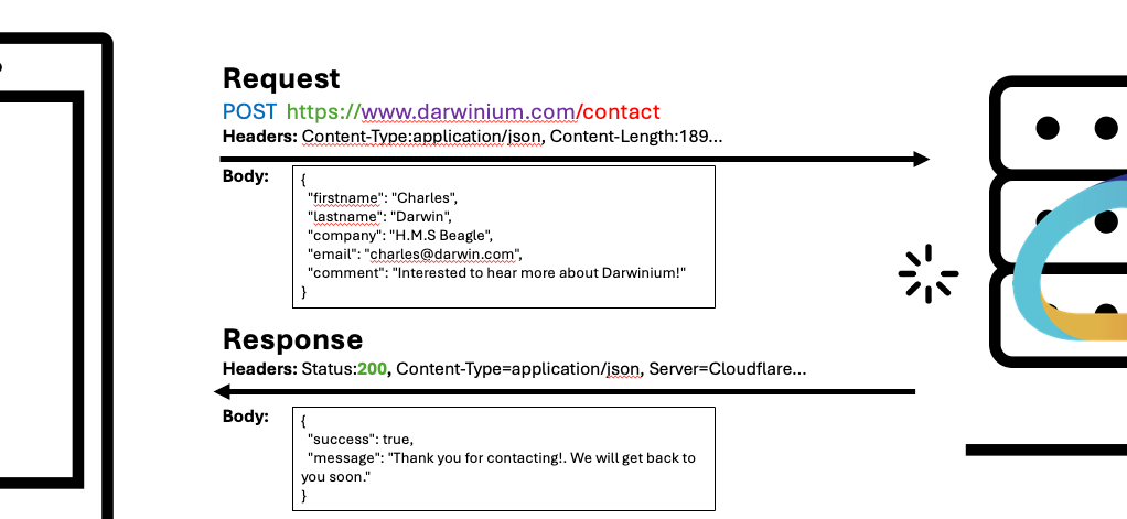- Body: The body is the data you want to POST or the data you GET back; think of it like the actual writing in a letter. The format of expected of that data (a form, a block of JSON etc. ) is specified on a header.