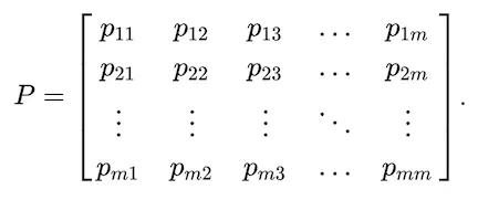 In statistics and probability theory this is the memoryless property and enables us to be able to calculate probabilities of reaching steps efficiently to detect anomalous journeys in real time. Given the probabilities of the next step we can create a matrix, P, the transition probability matrix containing the probability of transitions