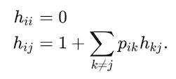 Where the first equation means that no time is elapsed moving from step i to step i, and the second equation means that we take at least one step if we’re not currently on the right step and the expected hitting time is the weighted average of the hitting times to all other steps.